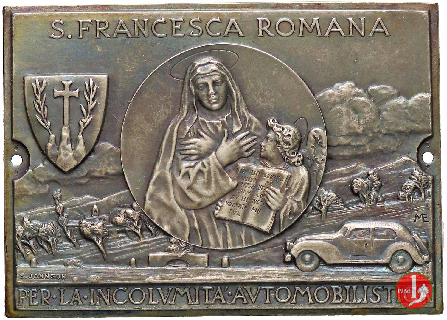 Francesca Romana - Automobilisti Dritto: S. FRANCESCA ROMANA entro medaglia centrale: busto velato e nimbato di fronte presso Angelo con libro aperto: TEMISTI = MANVM = EXTEPA = MEAM = ET IN = VOLVNTA = TVA _ REDVXISTI = ME = ET = GLOR = SVSCE = ME nel campo a sx: Stemma con Croce tra rami d'ulivo su tre alture nel campo sotto: paesaggio con automobile in transito verso sx in basso a sx: S. JOHNSON in basso a dx: ME in esergo: PER • LA • INCOLVMITA' • AVTOMOBILISTICA | |