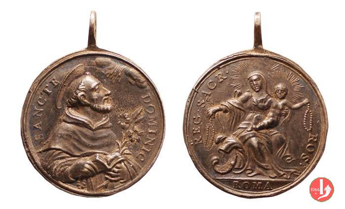 Dominikus Guzmán - Regina del Santo Rosario Dritto: S • _ DO _ MIN • busto nimbato a sx con saio, regge stelo di gligli e Vangelo La B. V. Maria seduta di fronte con volto raggiante, regge corona del Rosario e Bambino Gesú in esergo: ROMA | |