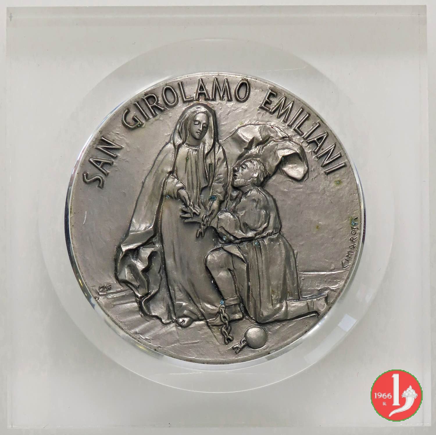 Girolamo Emiliani 1967 Dritto: S • GIROLAMO EMILIANI _ PADRE DEGLI ORFANI (entro doppia cornice continua) busto nimbato di 3/4 a dx con barba Padre Emiliani seduto, nimbato e con mantello, tra due bimbi in basso a dx: S.J | |