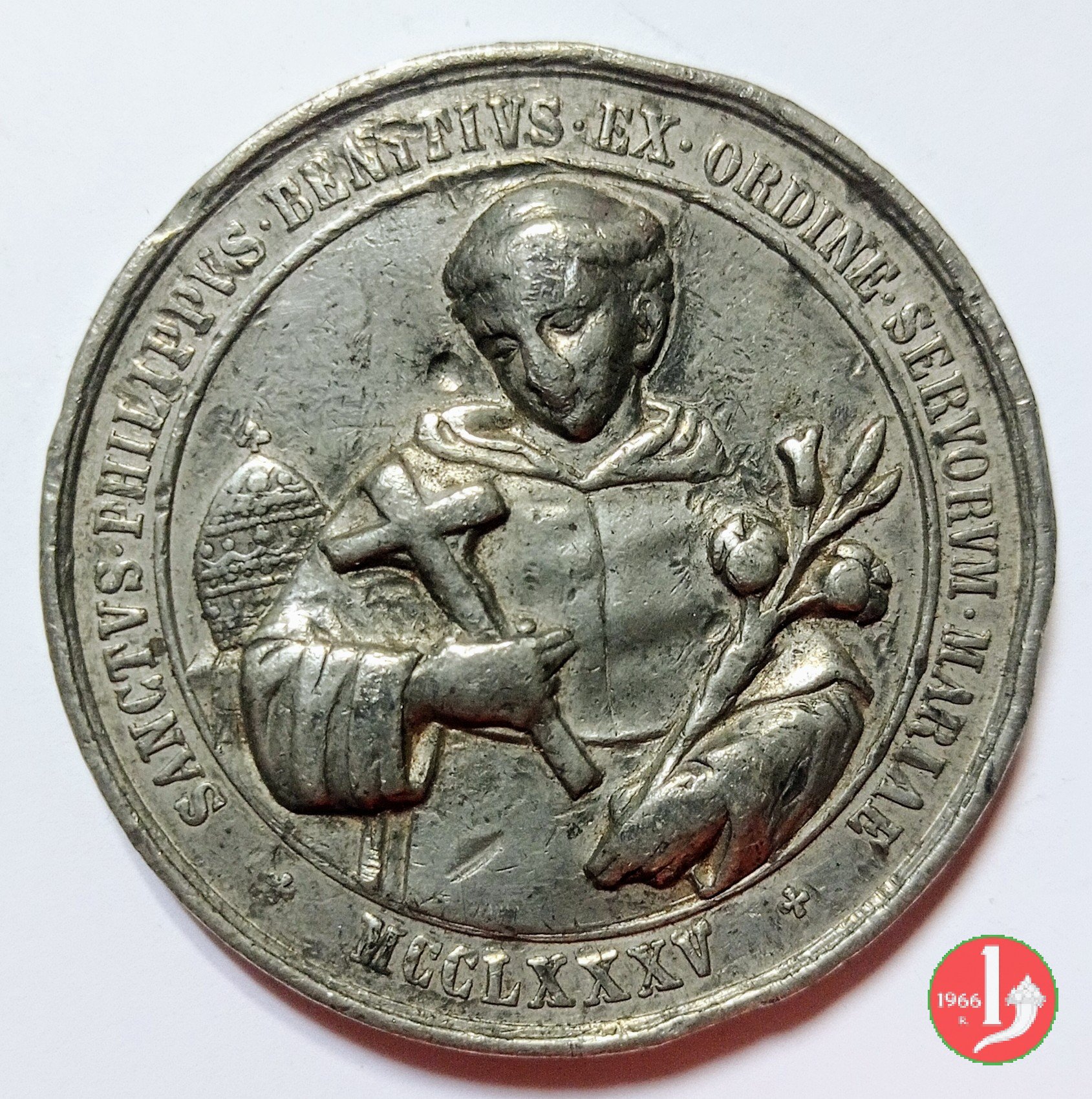 Filippo Benizi 1885 Dritto: SANCTVS • PHILIPPVS • BENITIVS • EX • ORDINE • SERVORVM • MARIAE = ✠ MCCLXXXV ✠ entro cerchio continuo: busto di fronte con abito talare, regge Croce e stelo di gigli sullo sfondo a sx: triregno | |