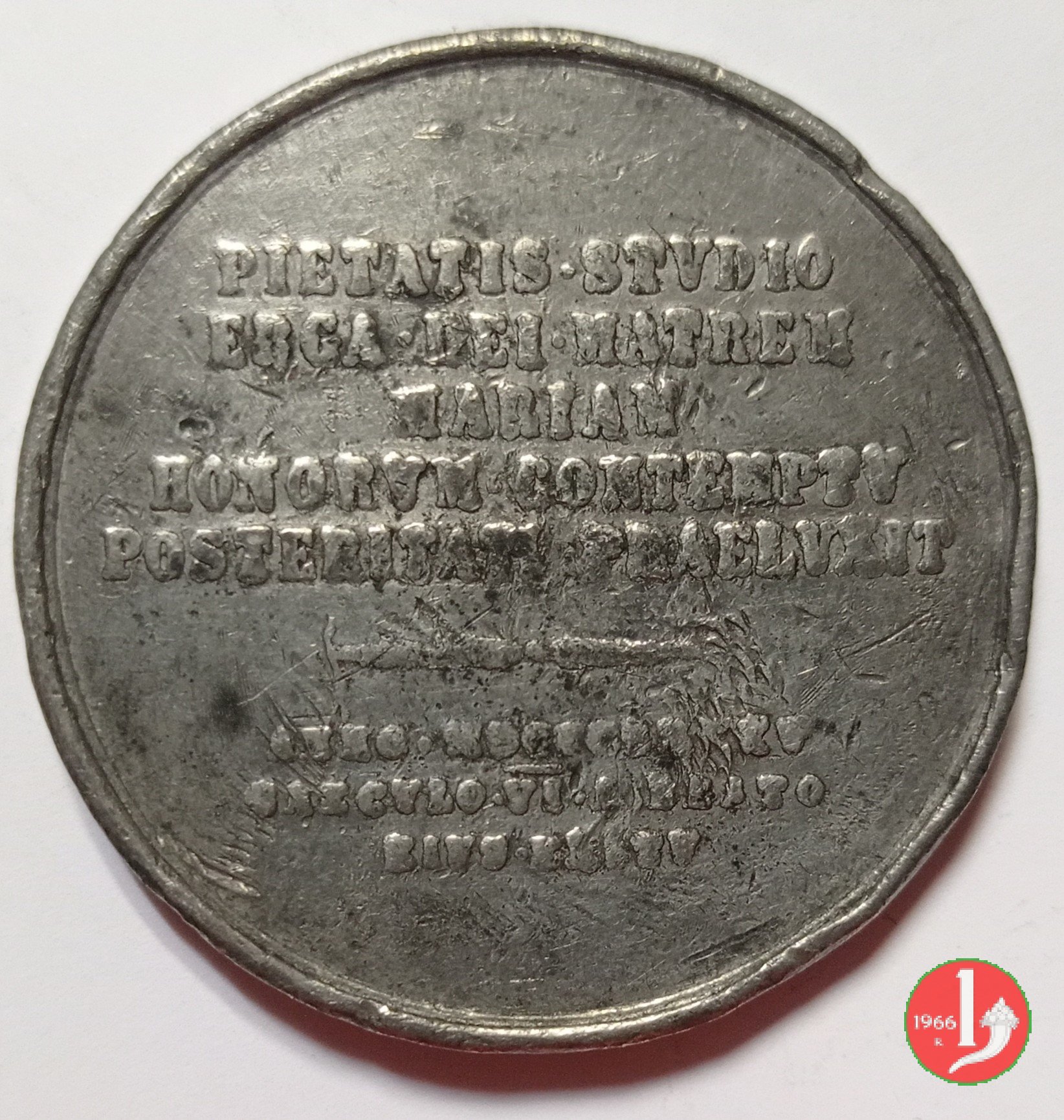 Ignazio Dritto: il Santo nimbato e genuflesso di 3/4 a sx, con pianeta mira luce raggiante a sx; a dx: statua della B. V. Maria in esergo: S. IGNAZIO La B. V. Maria col Bambino, seduta su nubi, appare a fedeli oranti radunati presso altare | |