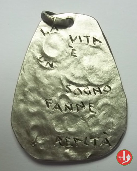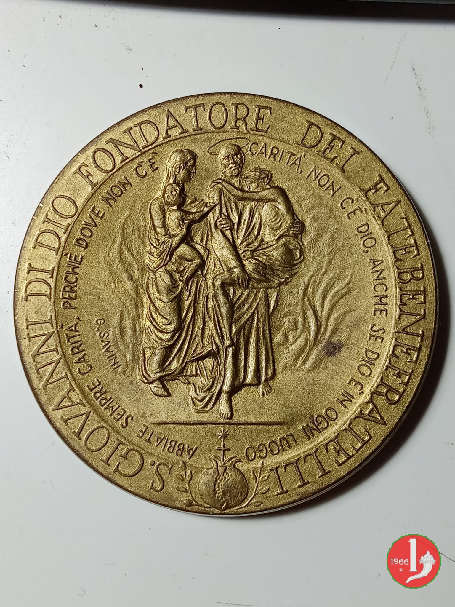 Giovanni di Dio - 400° Provincia Romana 1987 Dritto: S. GIOVANNI DI DIO FONDATORE DEI FATEBENEFRATELLI nel cerchio interno: ABBIATE SEMPRE CARITA' PERCHE' DOVE NON C'E' _ CARITA' NON C'E' DIO ANCHE SE DIO E' IN OGNI LUOGO Gesú nimbato, in piedi, regge ammalata in e donna con bambino in basso logo: melograno con Croce in basso, a sx: G. SAVINI albero di melograni ai lati: 1587 _ 1987 sotto: IV = CENTENARIO = DELLA PROVINCIA ROMANA in basso: G. SAVINI | |