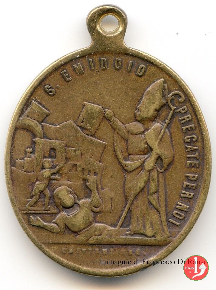 Emidio Dritto: S. EMIDDIO _ PREGATE PER NOI Il Santo in piedi, volto a sx, con mitra, piviale e pastorale, benedice terremotati in esergo: OLIVIERI. FEC. la B. V. coronata in piedi di fronte, regge Bambino | |