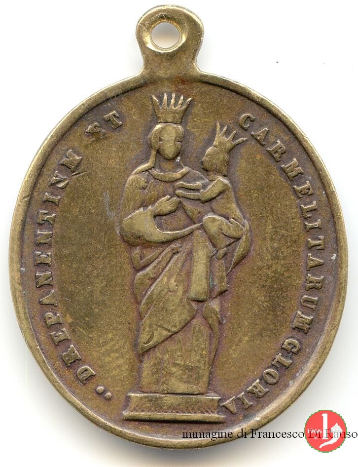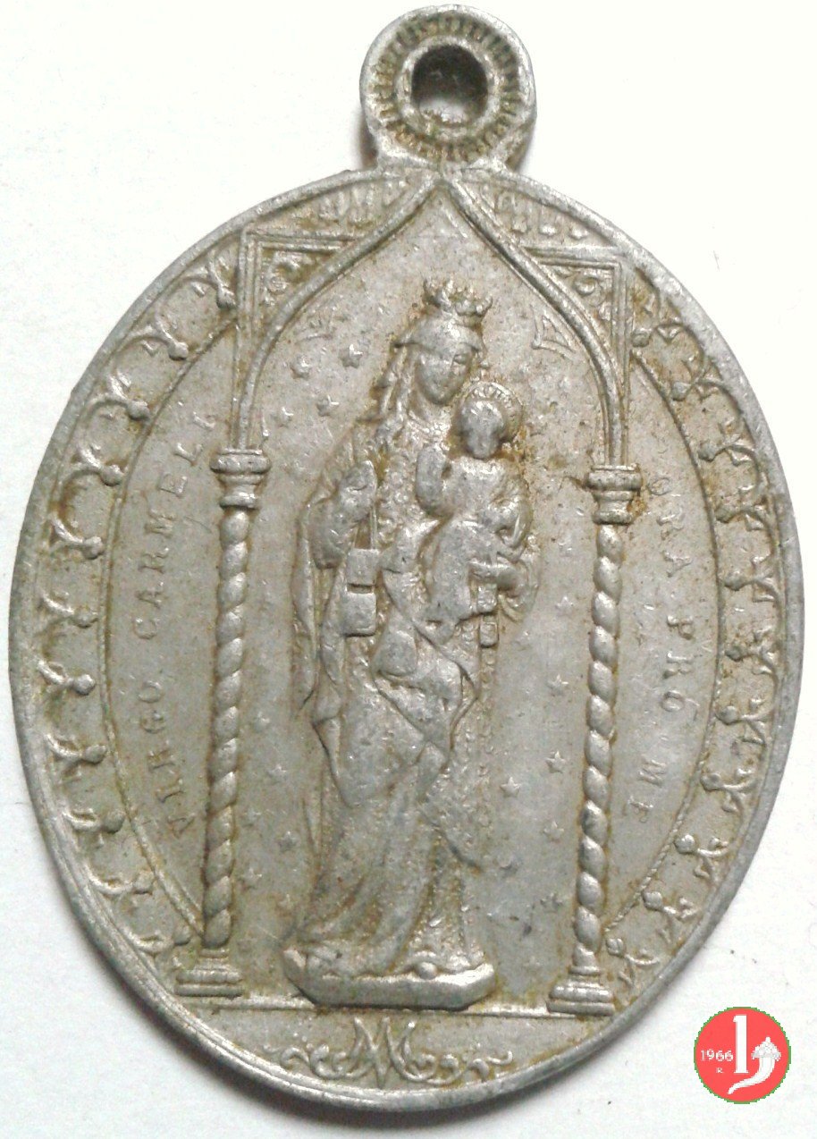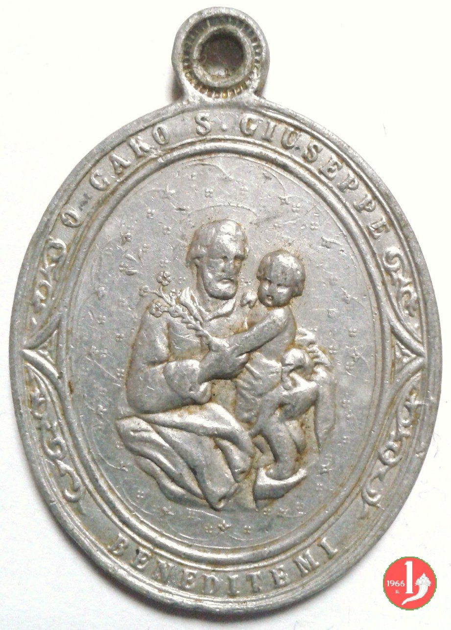 Giuseppe - Virgo Carmeli Dritto: O CARO S. GIUSEPPE = BENEDITEMI (tra fregi) in campo florea le e lievemente lobato: mezzo busto nimbato di S. Giuseppe col Bambino, regge stelo di gigli VIRGO CARMELI _ ORA PRO ME la B. V. Maria in piedi col Bambino in esergo: monogramma di Maria MA | |