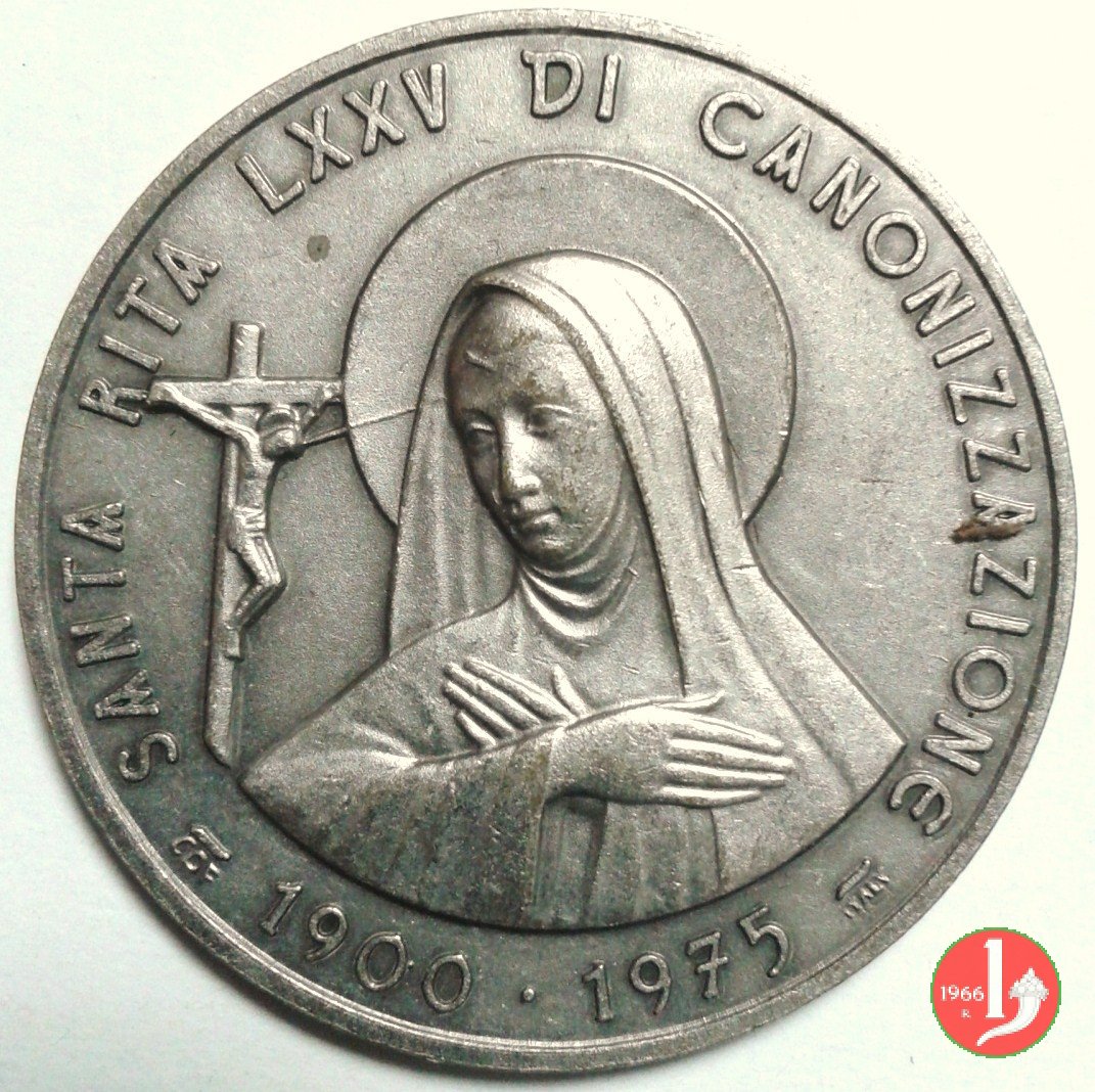 Rita da Cascia - 75° Canonizzazione 1975 Dritto: SANTA RITA LXXV DI CANONIZZAZIONE = 1900 • 1975 busto nimbato e velato, di 3/4 a sx, con mani incrociate sul petto, orante Croce in basso, a sx: CDF in basso, a dx: ITALY colomba dello Spirito Santo raggiante tra due figure si abbracciato in basso, a dx: CDF | |