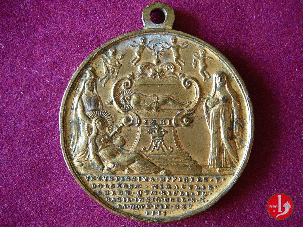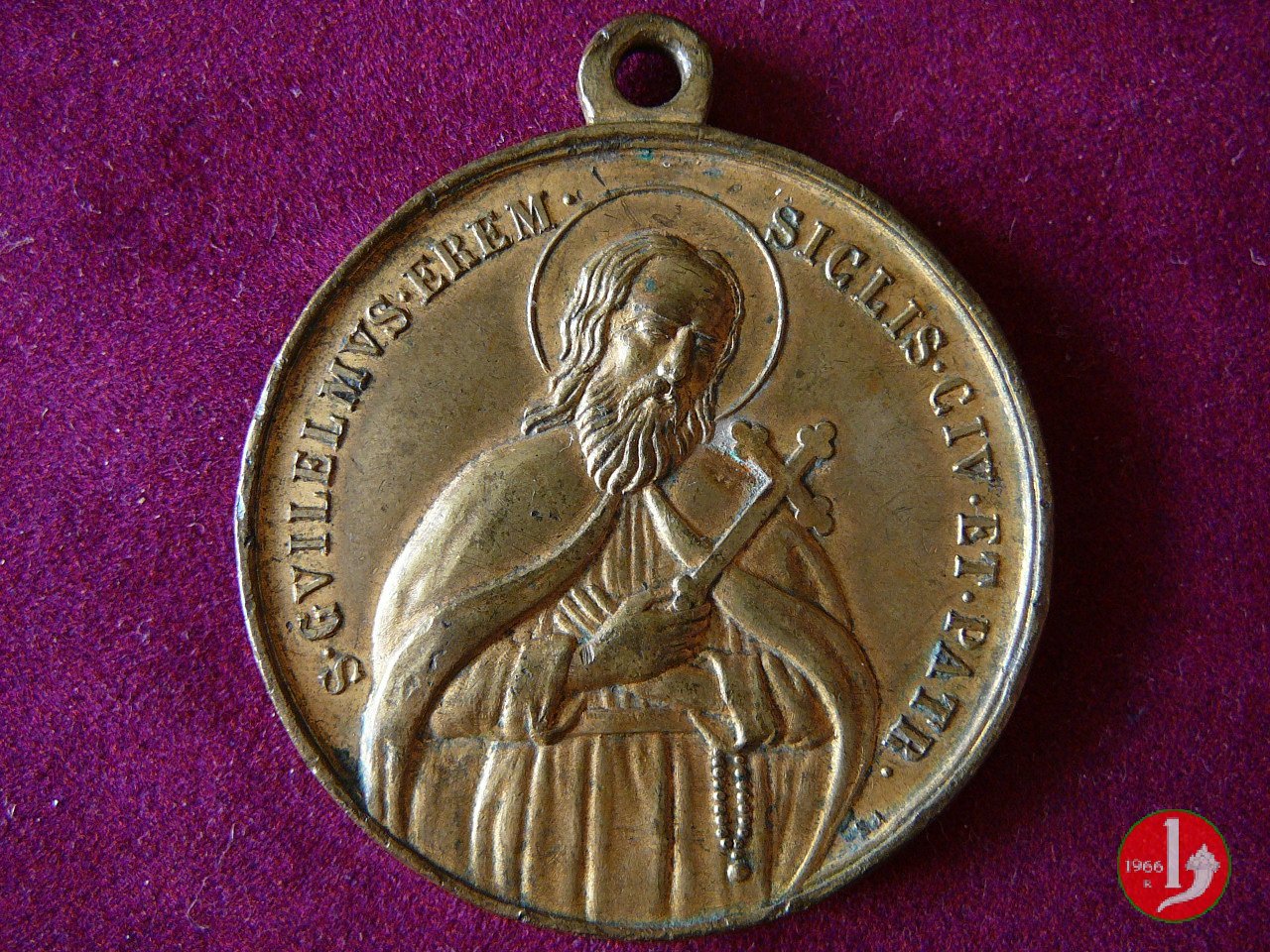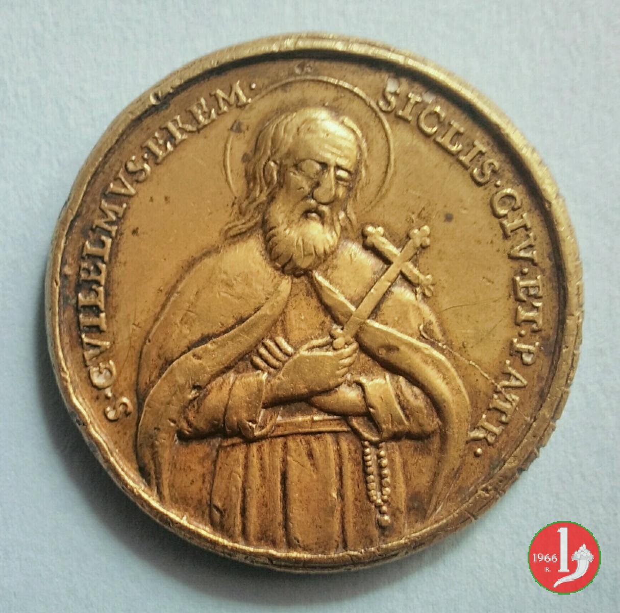 Guglielmo Eremita Dritto: S • GVILELMVS • EREM • _ SICLIS • CIV • ET • PATR • busto nimbato di 3/4 a dx con mantello e corona del Rosario, regge Croce in basso, a dx: SJ in esergo: VETVSTISSIMA • EFFIGIES • V • = DOLOROSAE • MIRACVLIS • = CELEB • QVAE • SICLI • IN • = BASIL • INSIG • COLL • S • M • = LA • NOVA • PIE • EXO = 1111 | |