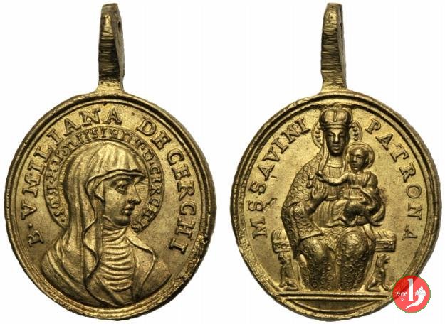 Umiliana de’ Cerchi Dritto: B • VMILIANA DE CERCHI busto nimbato e velato a dx la B. V. Maria coronata e nimbata, seduta di fronte, regge Bambino benedicente | |