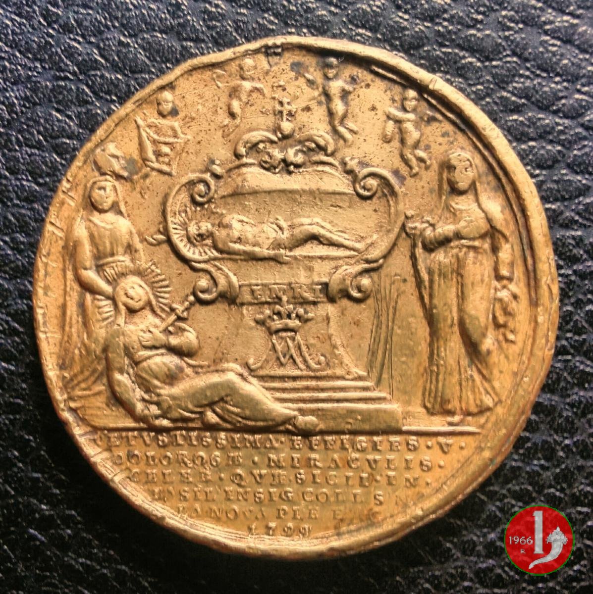 Guglielmo Eremita 1799 Dritto: S • GVILELMVS • EREM • _ SICLIS • CIV • ET • PATR • busto nimbato di 3/4 a dx con mantello e corona del Rosario, regge Croce in esergo: VETVSTISSIMA • EFFIGIES • V • = DOLOROSAE • MIRACVLIS • = CELEB • QVAE • SICLI • IN • = BASIL • INSIG • COLL • S • M • = LA • NOVA • PIE • EXO = 1799 | |