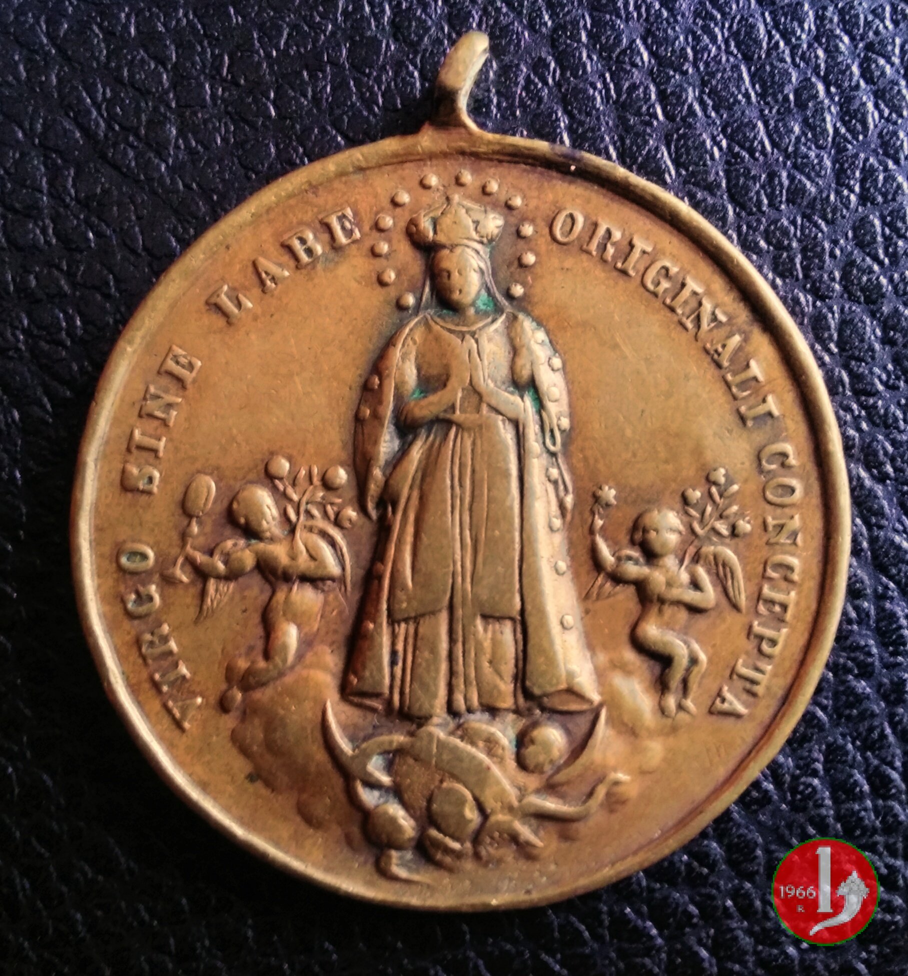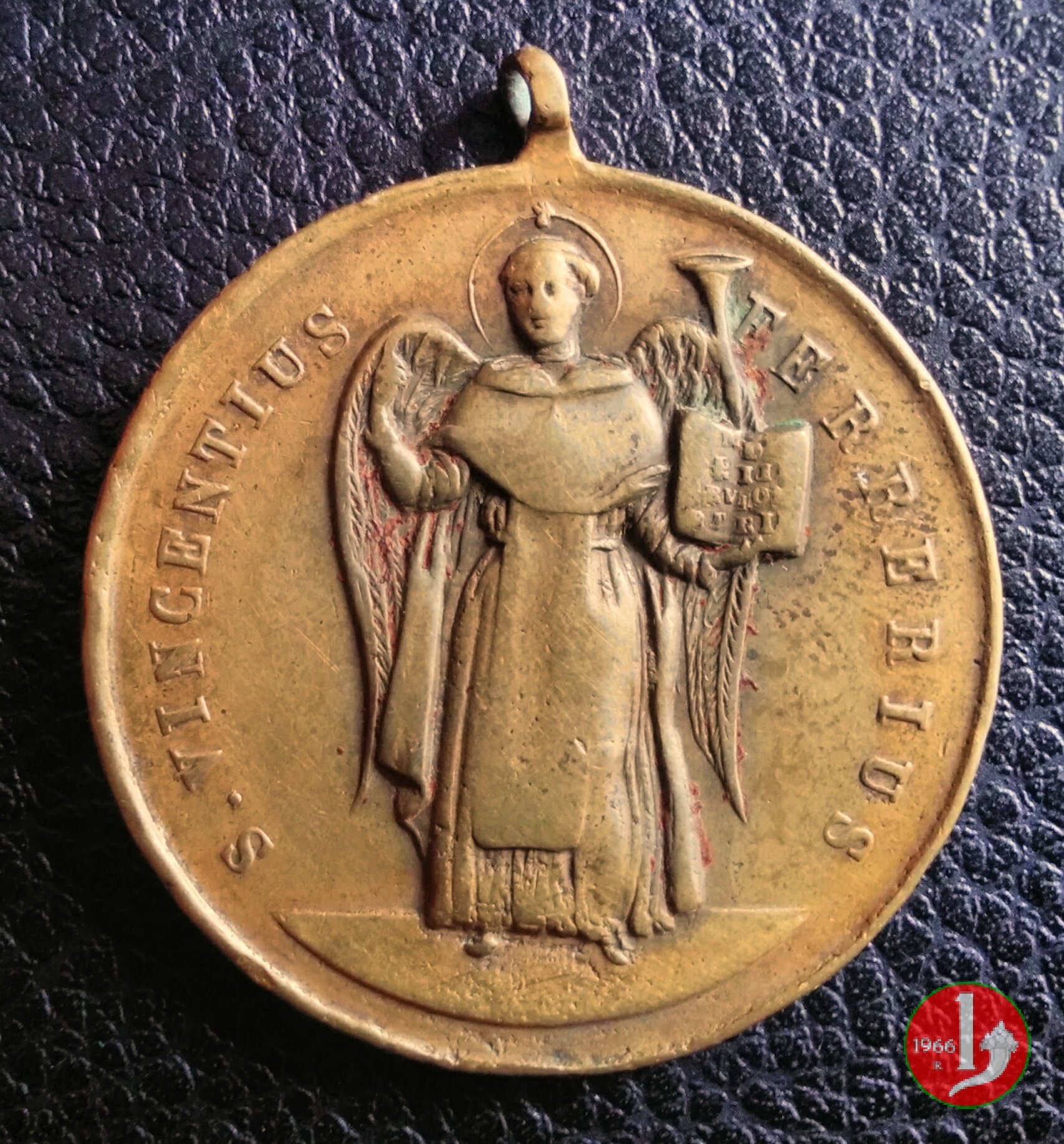 Vincenzo Ferreri - L'immacolata Dritto: S • VINCENTIVS _ FERRERIUS San Vincenzo nimbato, con fiamma in capo e benedicente di fronte con ali, regge libro e tromba La B. V. Maria in piedi di fronte, su Cherubini, nubi e crescente lunare, coronata ed orante di fronte, tra due angeli con steli di fiori | |