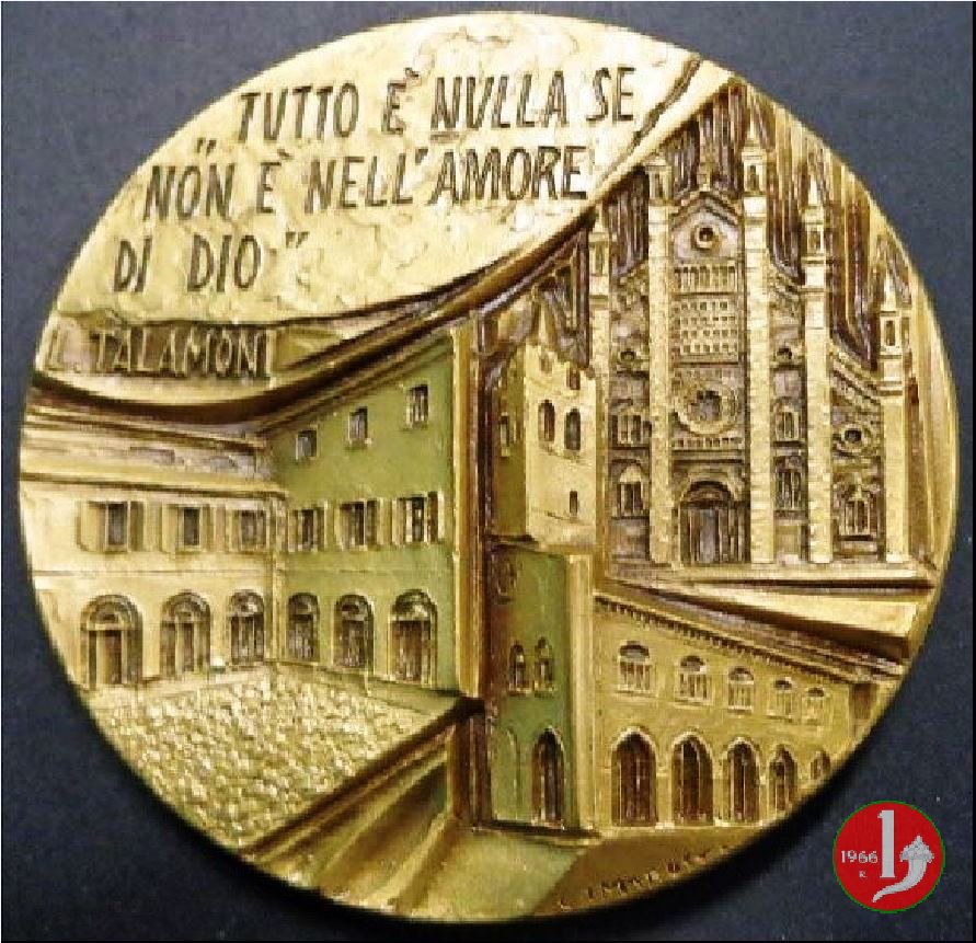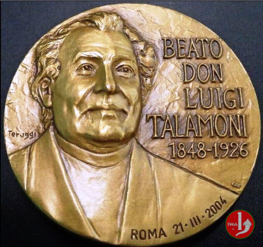 Luigi Talamoni 21-03-2004 Dritto: busto di fronte con abito talare e giacca in alto, a dx: BEATO = DON = LUIGI = TALAMONI = 1848-1926 sopra alla spalla a sx: TERUGGI sopra alla spalla a dx: CDF in basso, sul busto: ROMA 21 • III • 2004 composizione con edifici di Monza: il Duomo di Monza, l’Arengario e parte della casa madre dove si è sviluppata la Congregazione delle Suore Misericordine in Piazza Margherita 2 in basso: CIMAROSTI | |