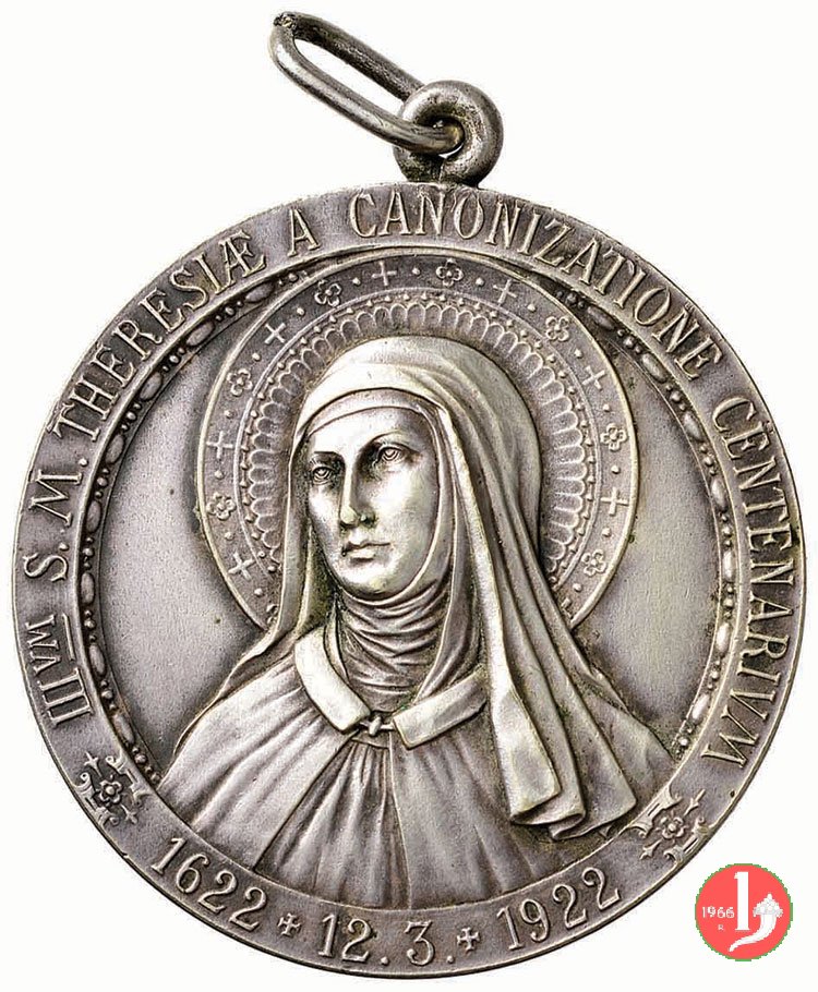 300° Canonizzazione Teresa del Bambino Gesú 1922 Dritto: IIIvm S. M. THERESIAE A CANONIZATIONE CENTENARIVM = 1622 ✠ 12.3. ✠ 1922 (tra fregi) entro cornice perlinata: busto nimbato di 3/4 a sx con velo ed abito talare sulla linea dell'esergo, a dx: KISSING in esergo, entro cartiglio: TERRIS, THERESA, BARBARIS = CHISTVM DATVRA AVT = SANGVINEM | |