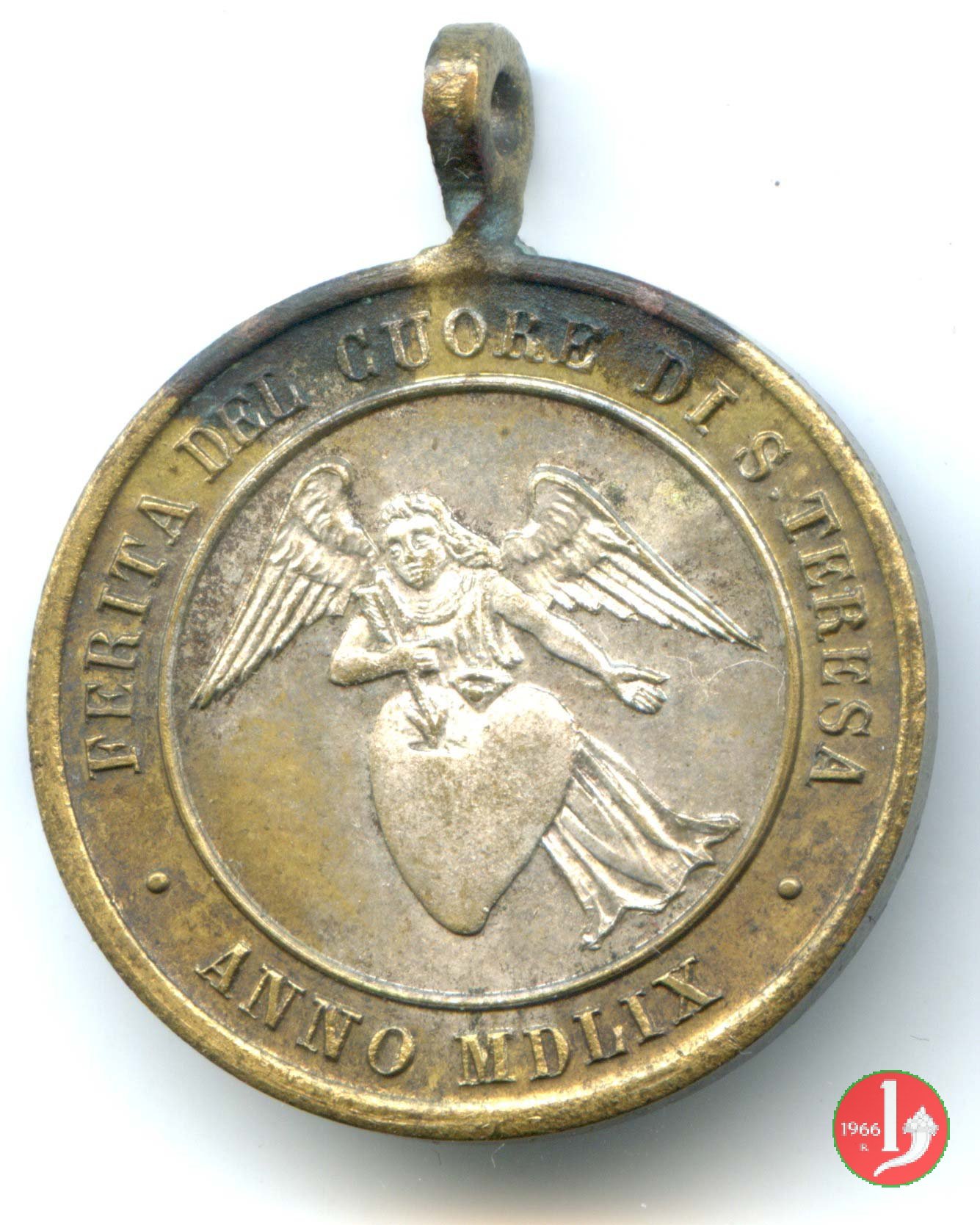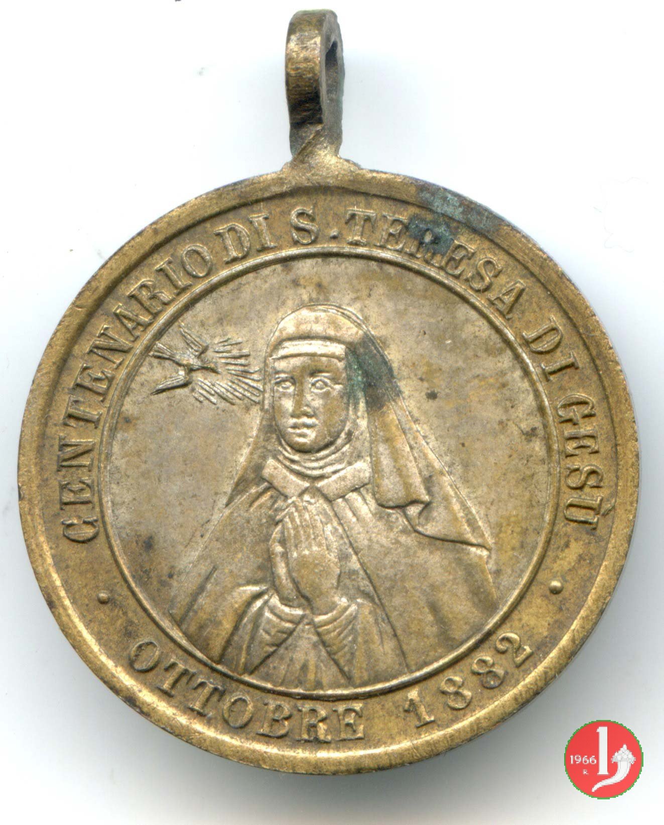 Teresa d'Avila 1882 Dritto: CENTENARIO DI S. TERESA DI GESU' = • OTTOBRE 1882 • entro cerchio continuo: busto orante e velato di 3/4 a sx con mantello ed abito talare, mira Colomba raggiante entro cerchio continuo: Angelo ad ali spiegate trafigge con freccia cuore | |