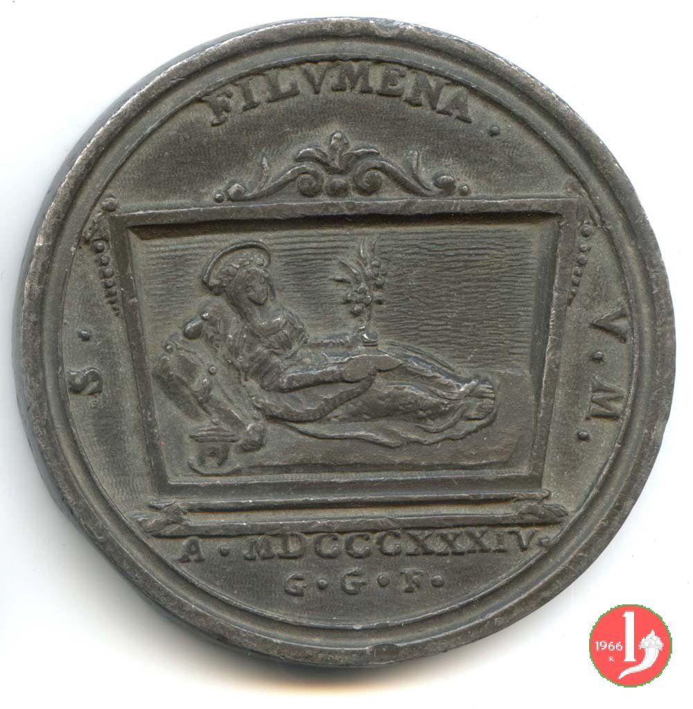 Filomena Dritto: S • _ FILVMENA • _ V • M • Sarcofago vitreo con le spoglie nimbate della Santa in esergo: A • MDCCCXXXIV • = G • G • F • | |