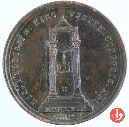 Matteo Carrieri Dritto: Matteo Carrieri con saio, genuflesso e orante presso altare, volto a sx Verso: nel campo: B • MATTHAEO • CARRERIO = VIGL • PATRON = IN III • SAECVLA • SOLEMN • = AN • 1840 • = DIEB • 5 • 6 • 7 • OCTOBRIS | |