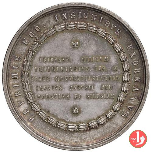 Luigi Mazzuchelli Dritto: ALOISIVS • MAZZVCHELLIVS • - COM • VIR • CLARISSIMVS busto a sx con giacca sotto: ZAPPARELLI nel campo entro ghirlanda d'alloro: * = TRIBVNVS • MILITVM = PROPRIETARIVS • LEG • X = PRAEP • MANVBALLISTARIO • = LEGATVS AVGVSTI PER = MORAVIAM ET SILESIAM = * |