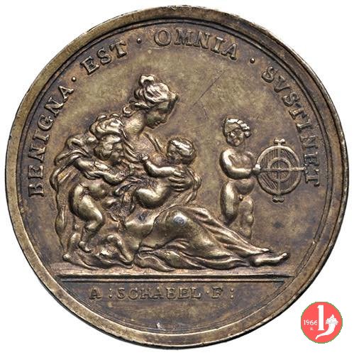 Scuola Grande di Santa Maria della Carità -V1758 Dritto: BENIGNA • EST • OMNIA • SVSTINET la figura allegorica della Carità seduta verso dx regge un bambino che sta allattando e ne abbraccia un altro; un terzo, sulla destra, mostra il simbolo della Scuola in esergo: A | |