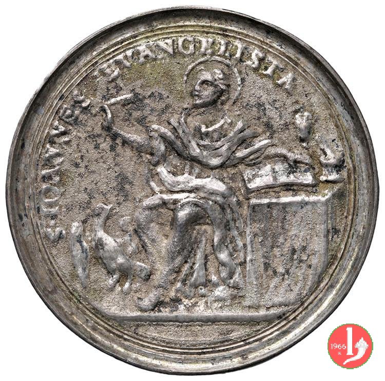 Scuola Grande di San Giovanni Evangelista -V1719 Dritto: S. IOANNES EVANGELISTA San Giovanni nimbato e seduto di 3/4 a sx presso Aquila, scrive su di un libro deposto su tavolo insieme a calice e calamaio in basso, ai lati: 18 _ 00 sopra a 17 _ 88 | |