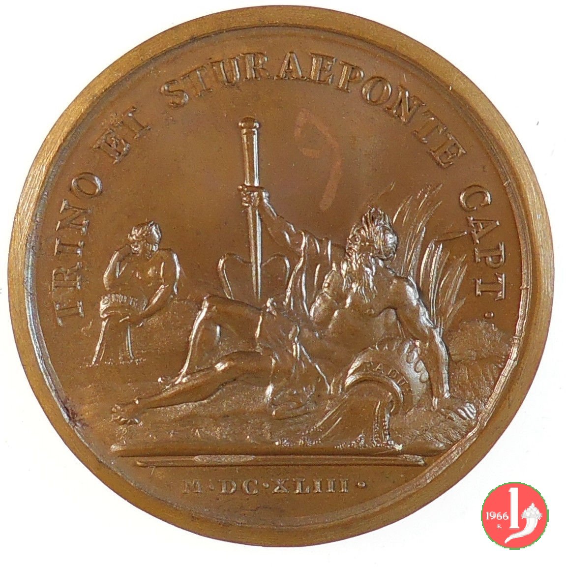 Presa di Trino e Pontestura-Luigi XIV 1643 Obverse: LUDOVICUS XIIII • REX CHRISTIANISS • busto a dx sotto: J • MAVGER • F • La figura allegorica maschile del Po, disteso verso sx, regge timone e versa acqua da orcio con PADUS e si rivolge alla figura allegorica dello femminile dello Stura che versa acqua da orcio con STURA in esergo: M • DC • XLIII • | |