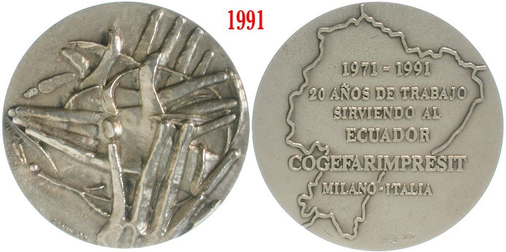 Ecuador - Cogefar 20 Anni di Lavoro 1991 Dritto: quattro mani sovrapposte a sx: GRILLI in basso: JOHNSON 1977 | |