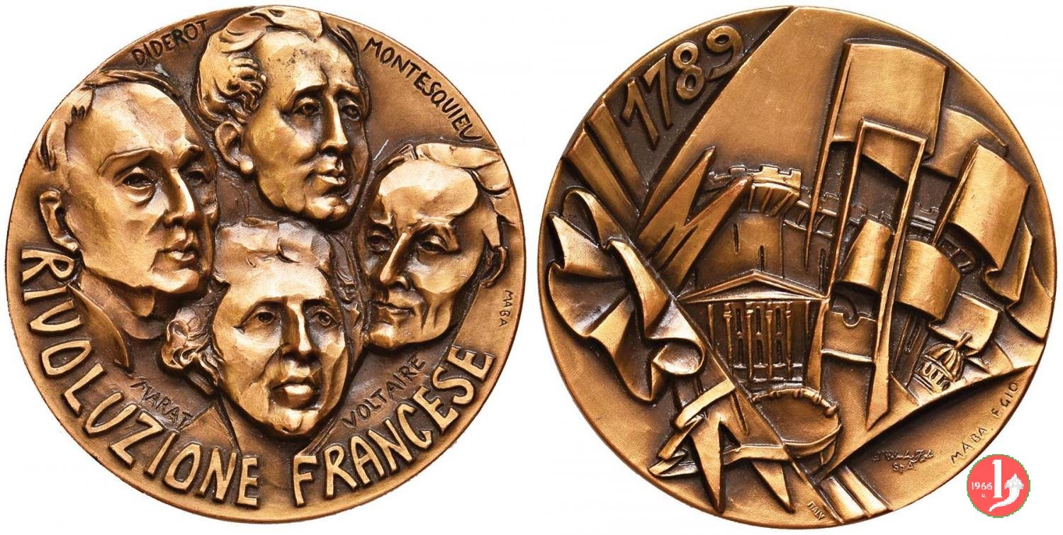 Francia - 200° Rivoluzione Francese 1989 Dritto: in basso circolarmente: RIVOLUZIONE FRANCESE teste dei quattro mentori della Rivoluzione Francese: DIDEROT _ MONTESQUIEU _ MARAT _ VOLTAIRE a dx presso il bordo: MABA La vista della Bastiglia sopra al fabbricato dell' Assemblea Nazionale a Parigi tra bandiere svolazzanti in basso: D. COLOMBO & F.GLI = SPA in basso a dx: MABA _ F. GIO in basso a sx: ITALY | |