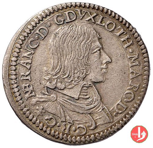 Testone o quarto di ducatone Dritto: (da sinistra) • NFRANC • D • G DVX LOTH • MARC • D C • B • C Busto a destra, a testa nuda; c. lin. Stemma inquartato di Lorena e sormontato da corona fogliata; in alto, tra le foglie della corona, in caratteri minuti (anno in cifre) c. lin. |