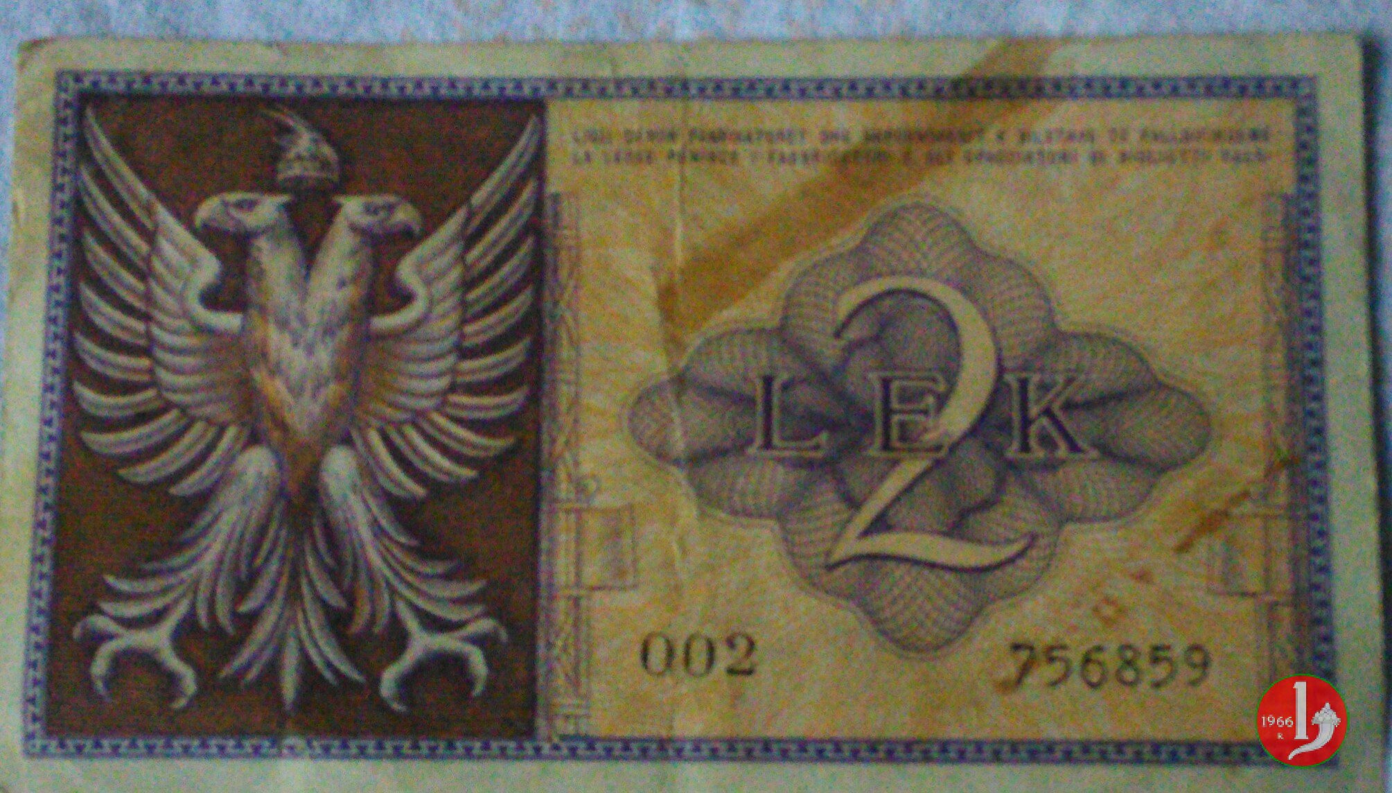2 Lek Obverse: Sulla destra busto di Eracle ed a sinistra al centro, uno scudo coronato, con aquila bicefala con ai lati la scritta "DY" in albanese e "DVE" in italiano; in alto la scritta bilingue della Banca Nazionale D'Albania. Reverse: A sinistra grande aquila bicefala e a destra al centro di un disegno, la cifra "2" sovrastata dalla scritta "LEK". | |