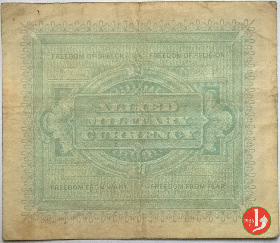1 Lira Dritto: Sullo sfondo paesaggio agricolo con covoni di grano e contorno azzurrino; cifra "1 LIRA" al centro e cifra "1" sui 4 angoli. Verso: Al centro scritta " ALLIED MILITARY CURRENCY" e tutto intorno le quattro libertà costituzionali statunitensi: "Freedom of Speech - Freedom of Religion - Freedom from Want - Freedom from Fear". | |