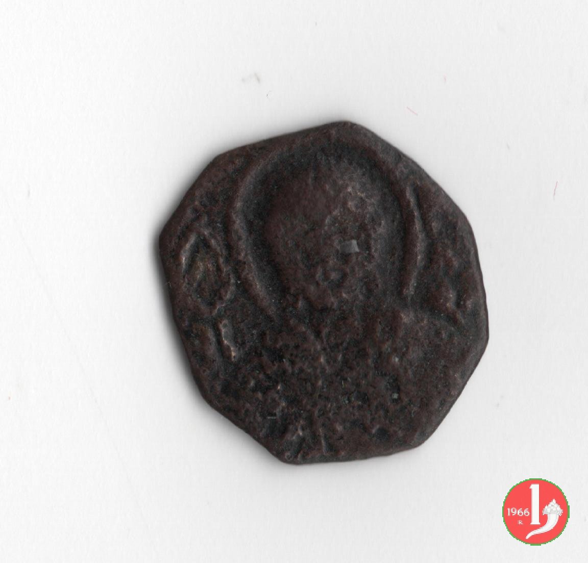 Follaro (S. Demetrio ++) Dritto: Contorno perlinato. Nel campo San Demetrio con corazza, una lancia bel braccio destro e uno scudo nella mano sinistra. Verso: Contorno perlinato. Nel campo legenda cufica con sopr e sotto ![]() ![]() | |