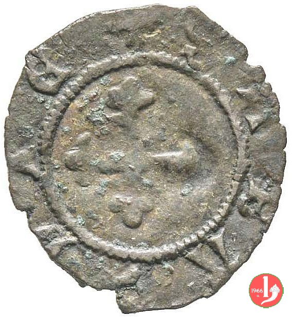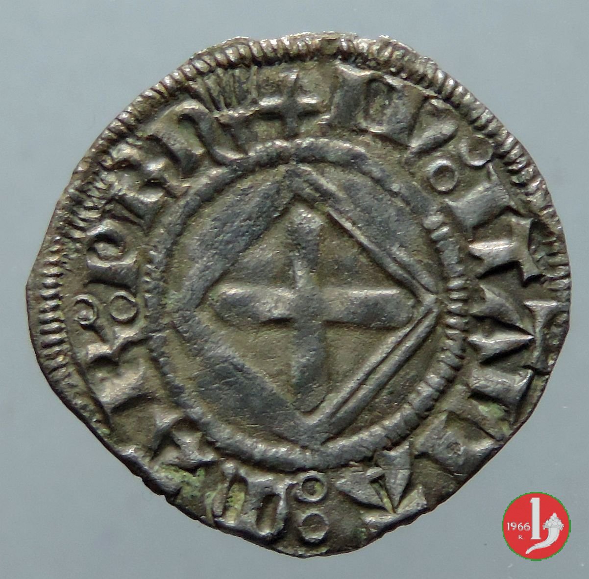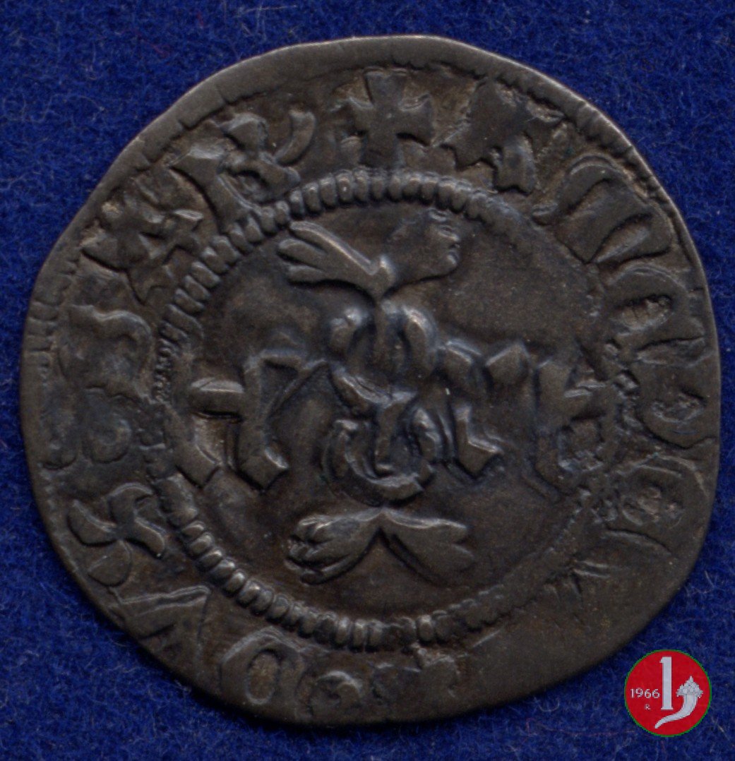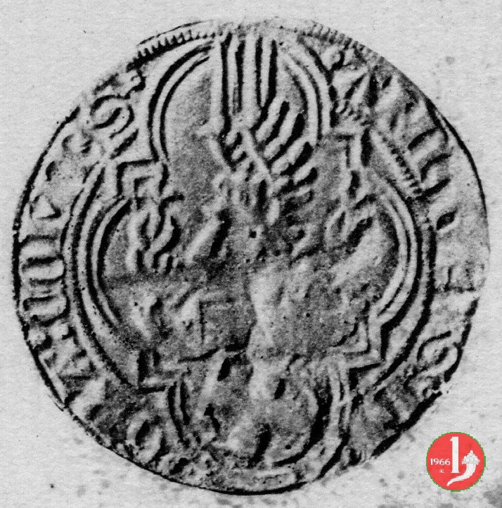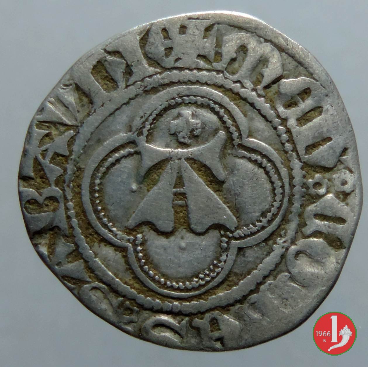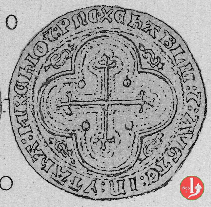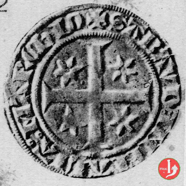 Quarto di grosso Dritto: Una A gotica in una doppia cornice quadrilobata con quattro globetti agli angoli, intorno: croce MED Verso: Croce patente accantonata da quattro stelle a sei punte, intorno: croce IN | |