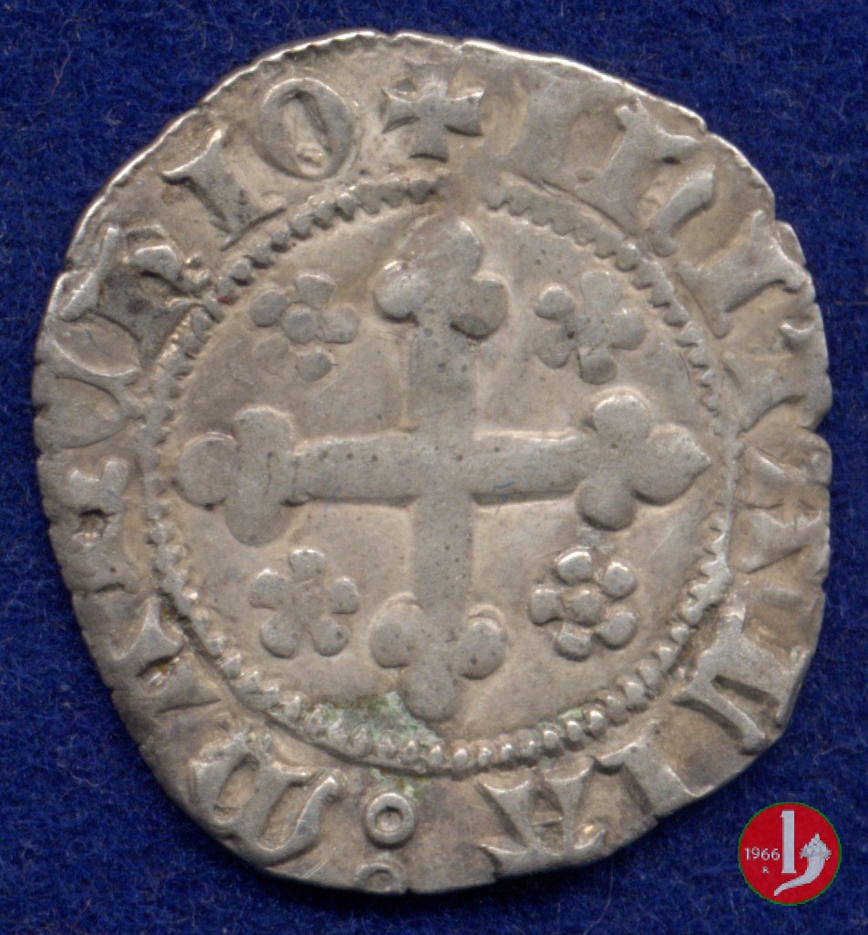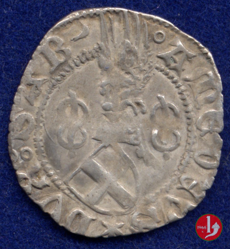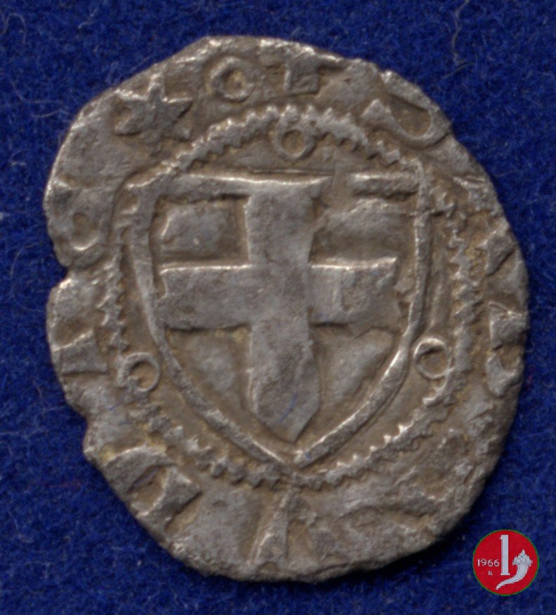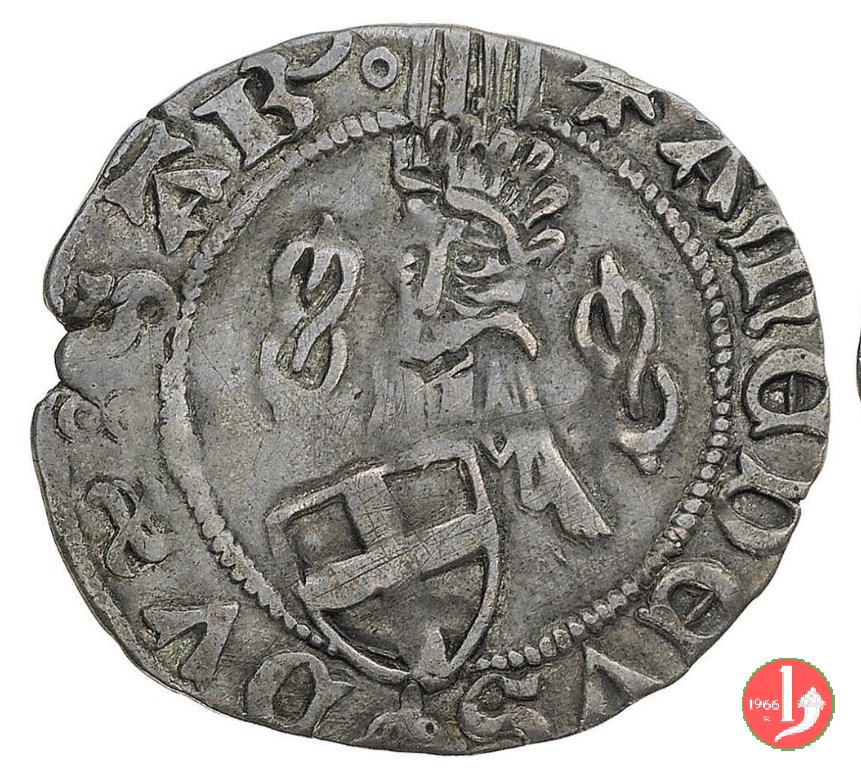 Grosso bianco dozzeno Dritto: Grande A gotica simmetrica accantonata da quattro stelle a cinque punte, intorno: croce segno IMO segno COM segno SABAUDIE Verso: Croce doppia che taglia le legende accantonata da tre bisanti ogni cantone, intorno segno INIT ALIA MAR ChIO | |