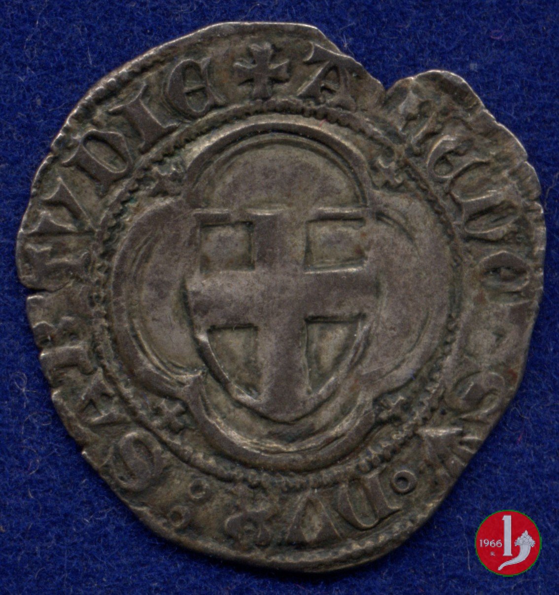 Obolo di bianchetto Dritto: Scudetto sabaudo dentro una cornice quadrilobata doppia, intorno: croce AMEDEUS segno DUX Verso: Croce piana accantonata da quattro crocette, intorno: croce SABAUDIE • ET • P' | |