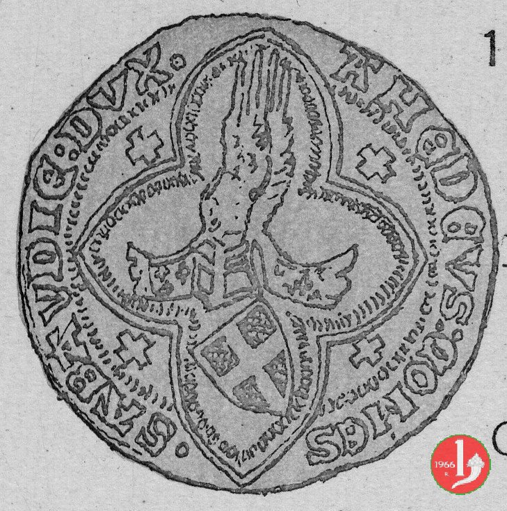 Fiorino d'oro Dritto: Grande giglio fiorentino, intorno: croce AMED COMES Verso: Santo benedicente in piedi con un mantello di pelliccia che regge la croce con la sinistra, intorno S IOHA NNES B scudetto sabaudo | |