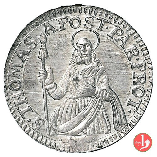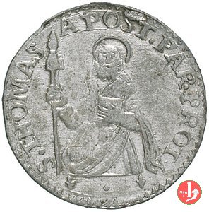 Verso: San Tommaso con lancia e libro, intorno S • THOMAS • APOST • PAR • PROT •. In esergo (giglio) • (giglio).