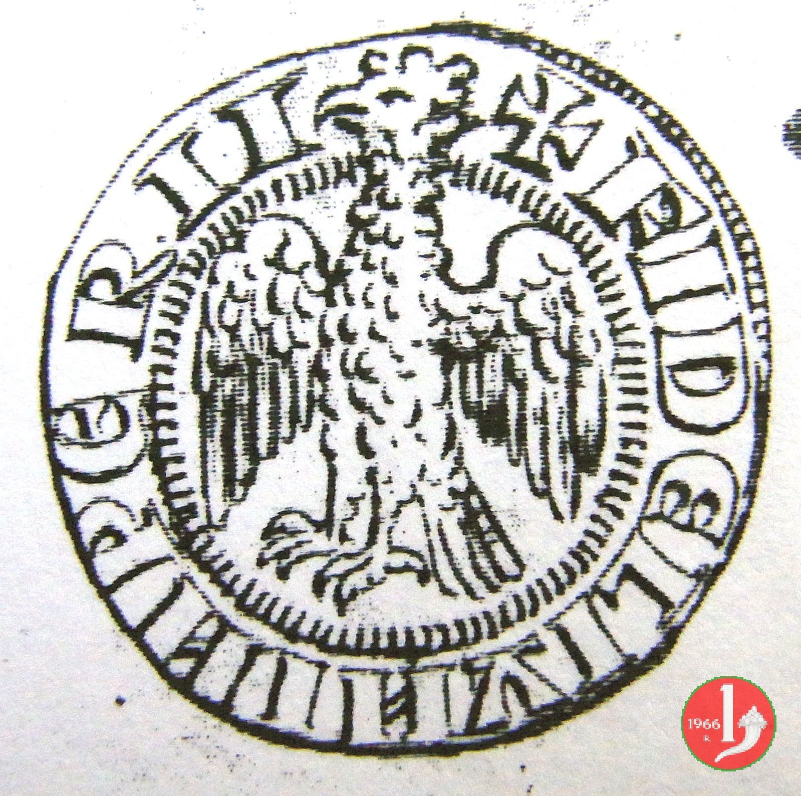 Dritto: ✠ (leoncino con a fianco un castelletto sotto il quale c'è un piccolo anellino) •IANVA •QVAM •DEVS •PROTEGAT •
