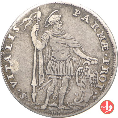 Verso: Figura di San Vitale in armatura con vessillo nella mano destra e scudo riportante lo stemma farnesiano nella mano sinistra. Ai lati dello scudo sigla dello zecchiero (GG per Giovanni Gualtieri). Intorno, S • VITALIS PARMAE • PROT •