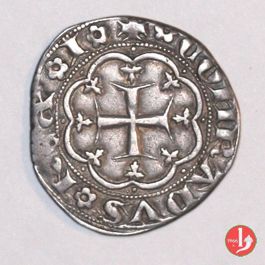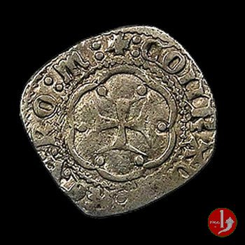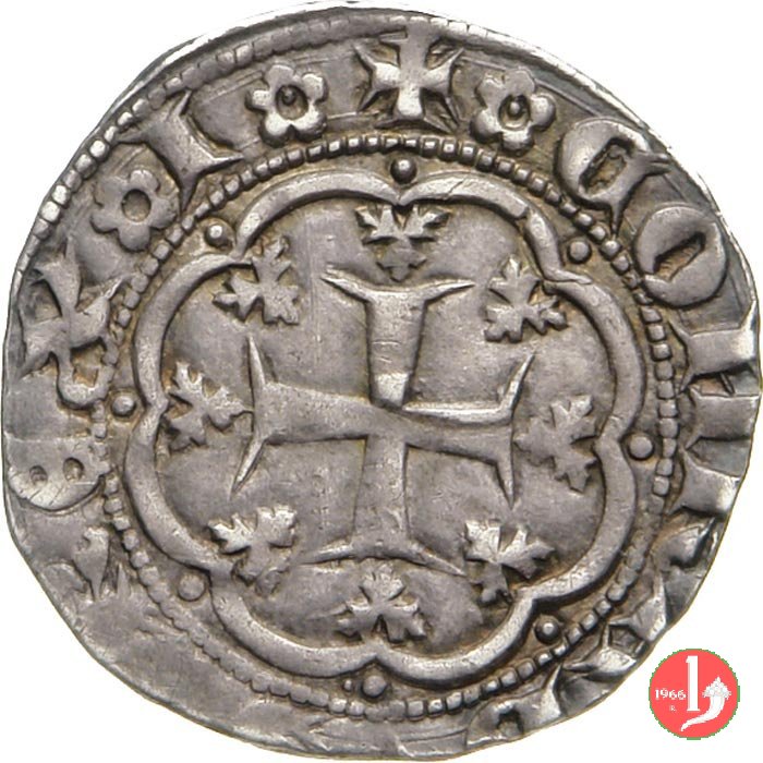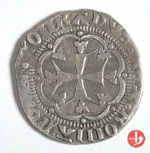 Grosso (Doge XXI) Dritto: ✠ ![]() T ![]() C ![]() DVX ![]() IAIIVEIISIV ![]() XXICastello in 6 archetti con palline agli angoli, in cerchio perlinato. Ai lati del castello le iniziali del doge T e C. Croce patente in 6 archetti con palline agli angoli, in cerchio perlinato. Una stella nel secondo quadrante della croce. | |