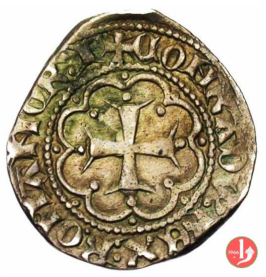 Genovino Dritto: ✠ CONRADV' • REX • ROMANOR Castello in 8 archetti e ornati con palline agli angoli, in cerchio perlinato. Croce patente in 8 archetti e ornati con palline agli angoli, in cerchio perlinato. | |