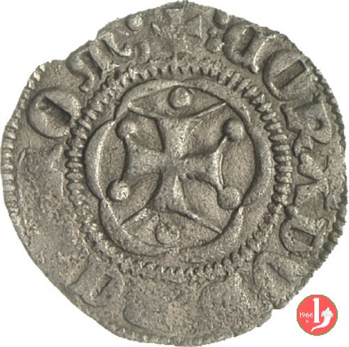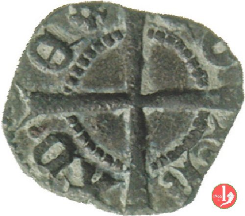Soldino (Doge XX) Dritto: ✠ Castello in 6 archetti con palline agli angoli, in cerchio perlinato. Croce patente in 6 archetti con palline agli angoli, in cerchio perlinato. | |