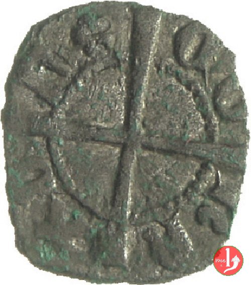 Soldino (Doge XXI) Dritto: ✠ Castello in 6 archetti con palline agli angoli, in cerchio perlinato. Croce patente in 6 archetti con palline agli angoli, in cerchio perlinato. | |
