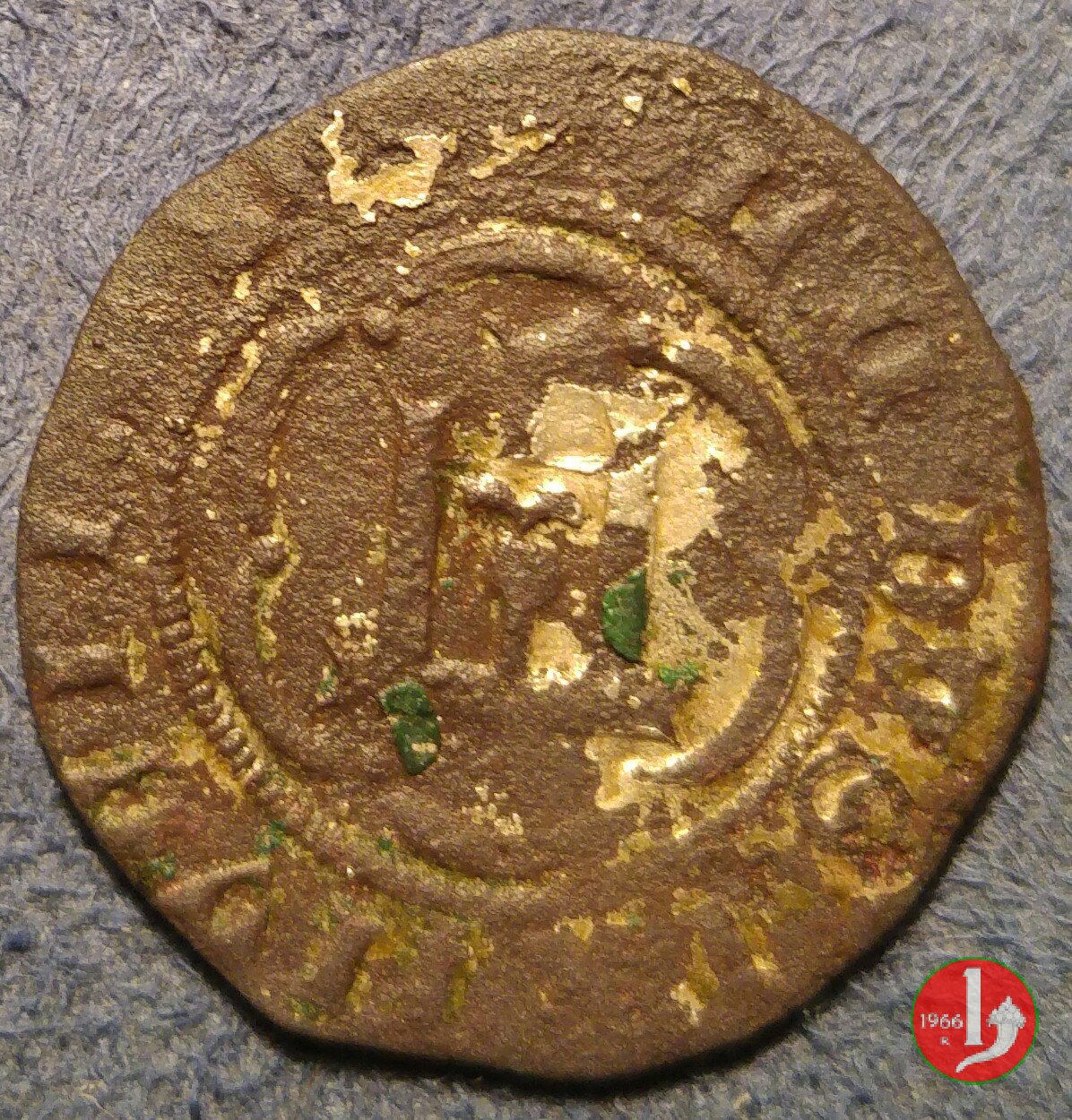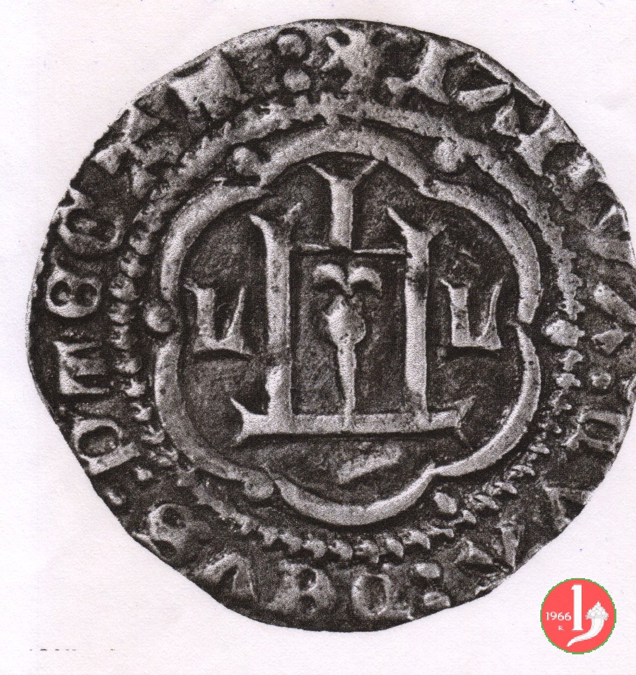Minuto Dritto: F ![]() • IACastello che taglia la leggenda in basso e cerchio perlinato. La lettera "D" rappresenta Dominus e "IA" rappresenta Ianua.