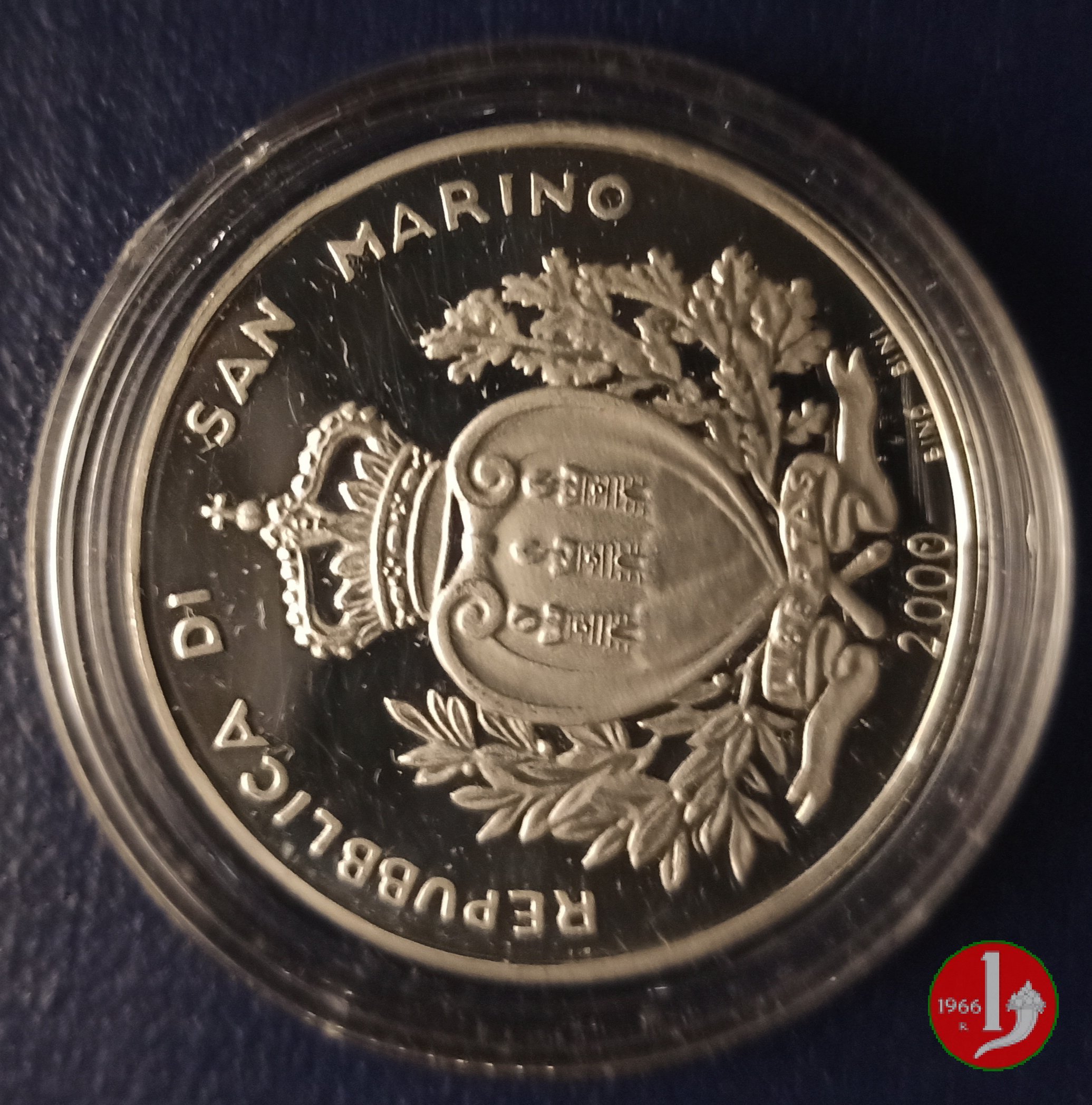 Dritto: Lo stemma ufficiale con attorno la legenda REPUBBLICA DI SAN MARINO; in basso è l'anno di emissione 2000, ed il nome dell'autore del bozzetto BINO BINI.