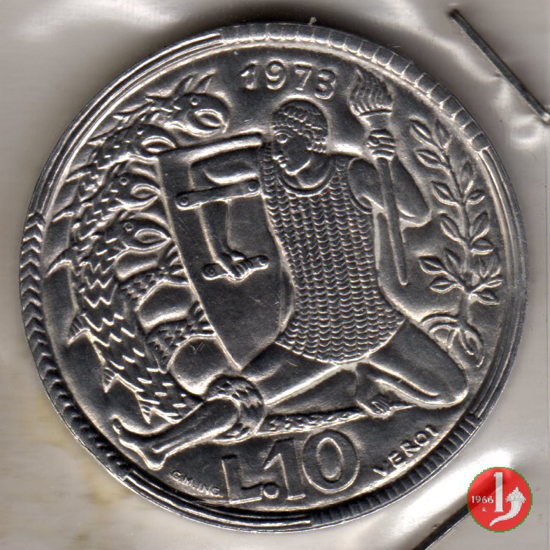 Verso: All'interno di un cerchio, stemma araldico di San Marino con le tre torri piumate e sormontato dalla corona della sovranità. Ai suoi lati indicazione del valore (L • 10) e, in basso, un fascio con scure in orizzontale. Intorno, REPVBBLICA DI • S • MARINO, in basso indicazione degli autori (E • SAROLDI A • M • INC.) e il segno di zecca (R).