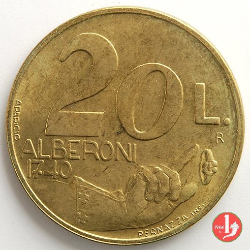 Verso: All'interno di un cerchio, merlatura con le tre piume araldiche di San Marino. In alto corona rappresentante la sovranità sanmarinense. In basso indicazione del valore (L • 20) all'interno di un quadretto. In esergo, fascio con scure posto in orizzontale al di sotto del quale si trova il segno di zecca (R). Sopra il quadretto del valore indicazione degli autori (E. SAROLDI e A • M • INC •). Intorno • REPVBBLICA • DI • S • MARINO •.