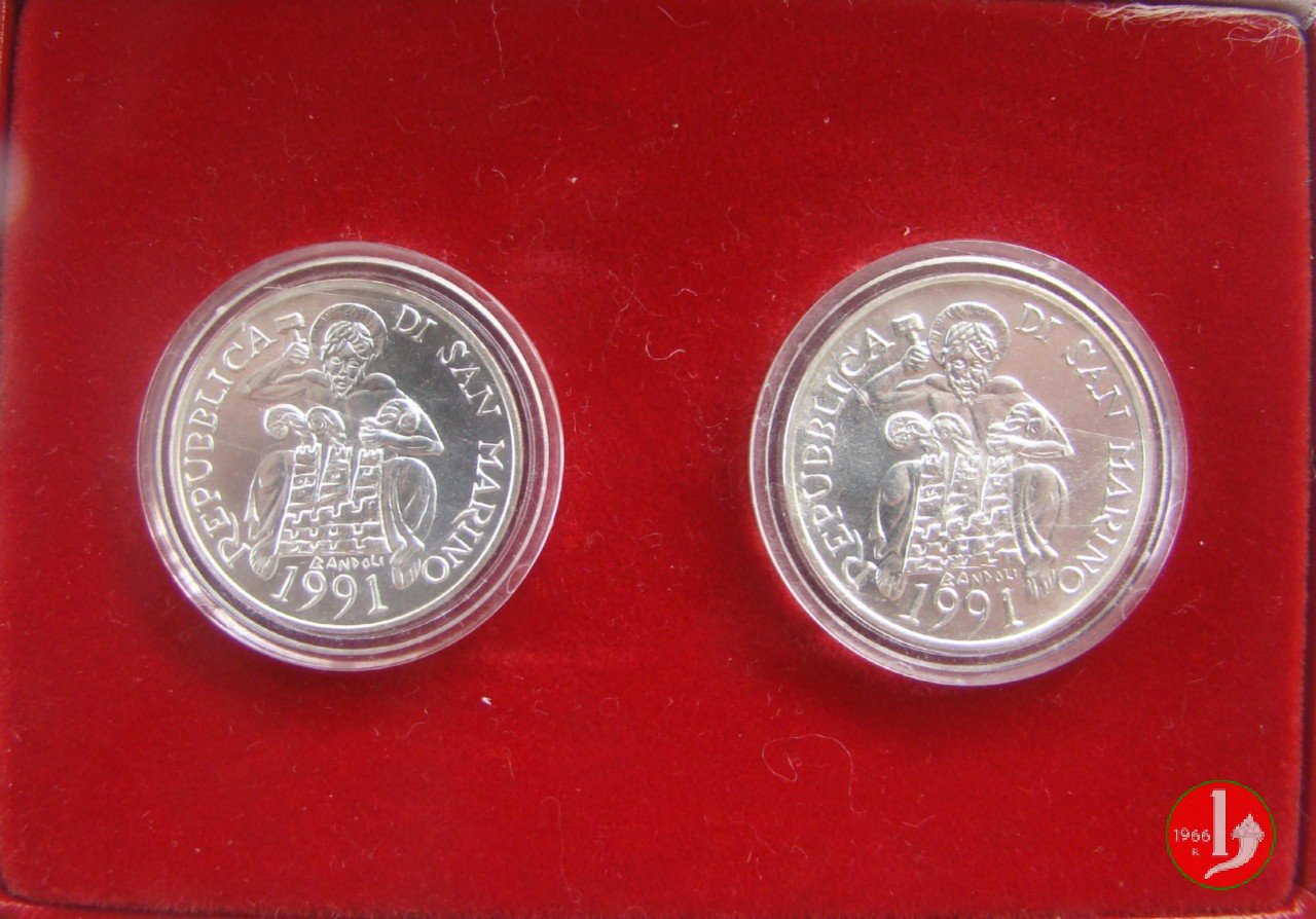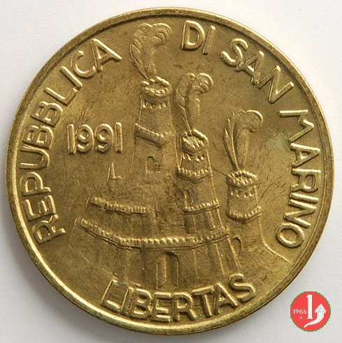 San Marino e le tre torri con, attorno, la legenda REPUBBLICA DI SAN MARINO 1991 ed il nome dell'autore del bozzetto BANDOLI.