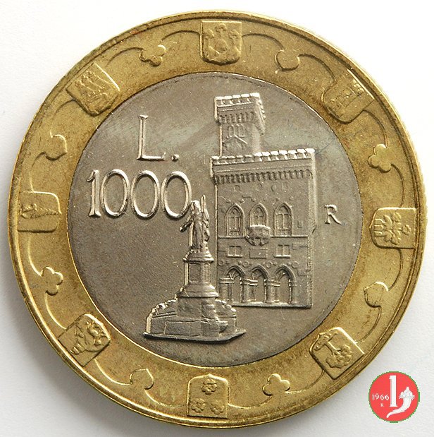Verso: Lo stemma ufficiale stilizzato dello Stato - a semicerchio: REPUBBLICA DI SAN MARINO. Alla base della composizione la dicitura: L. 1.000.