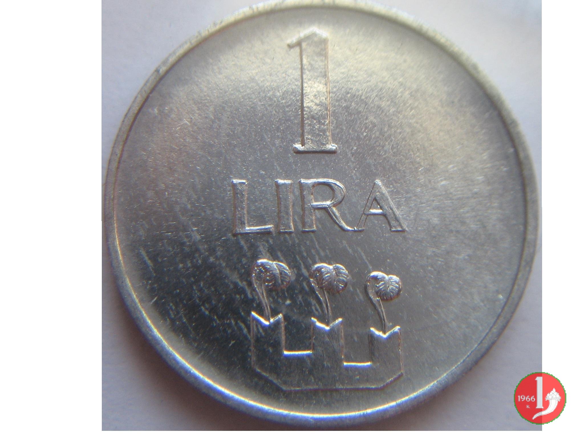 Dritto: Valore (1 LIRA) e millesimo su tre righe contornato da due rami di alloro, in basso il segno di zecca (M per Milano, R per Roma).