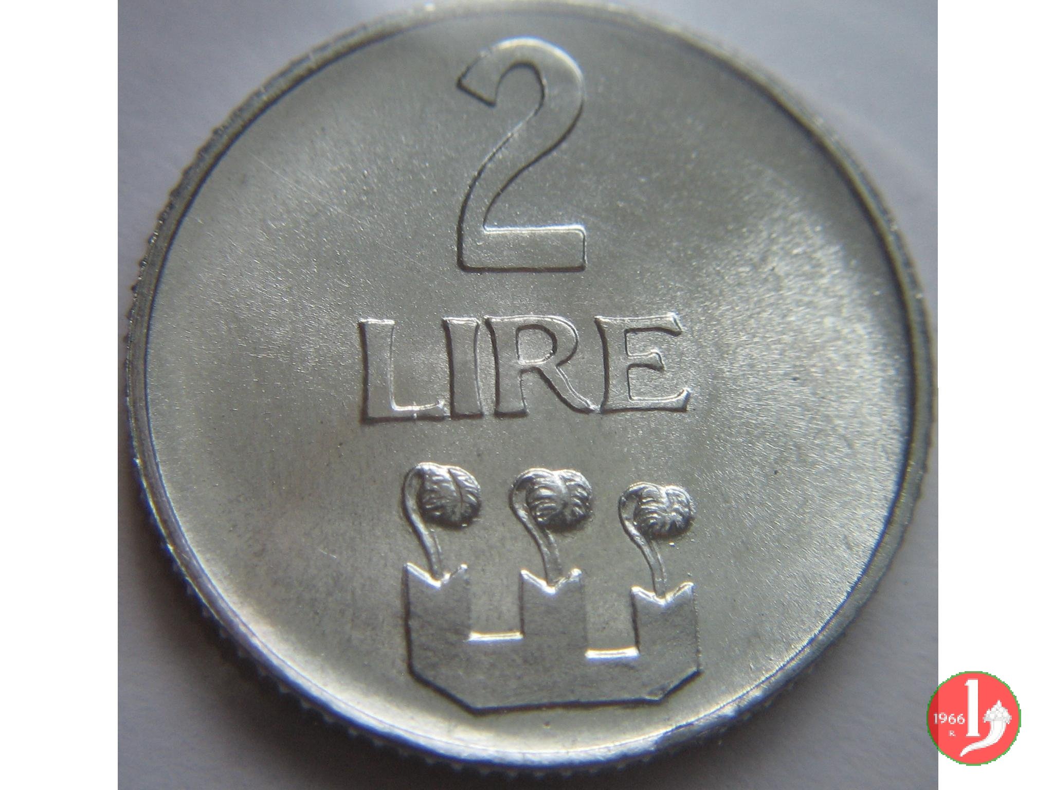 Dritto: Valore (2 LIRE) e millesimo su tre righe contornato da due rami di alloro, in basso il segno di zecca (M per Milano, R per Roma).