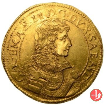 10 Scudi d'oro III tipo Obverse: Busto del duca rivolto a destra, sotto una crocetta, intorno • data • CARO • FRANC • EM • D • G • DUX • SAB • Reverse: Scudo completo, coronato e circondato dal collare dell'annunziata, intorno: PRIN • PEDEMON REX • CYPRI • E • C , il tutto intercalato da rosette | |