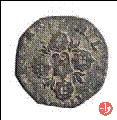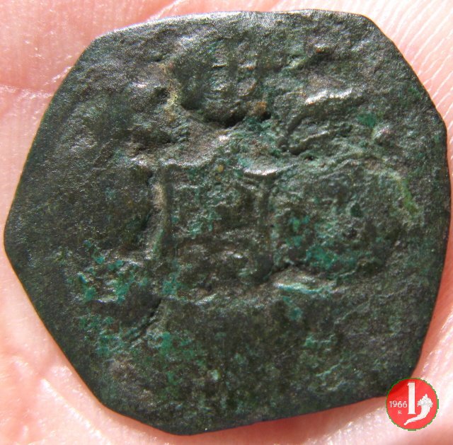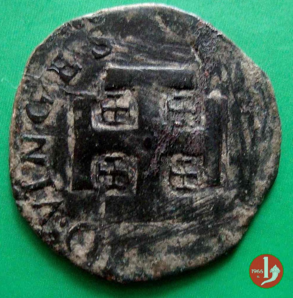 Grano con stemma Dritto: + PHILIPP • III • DG • REX • AR • VT • SI • E • T • HIERV, Due tronchi a croce di S. Andrea, cantonati in alto e in basso da acciarini, a dx e sx fiamme. Verso: Scudo a forma di cuore, coronato in cartella, il campo dello scudo è liscio e diviso da una banda, ai lati 16 06 entro ghirlanda di quercia. | |