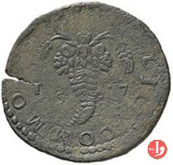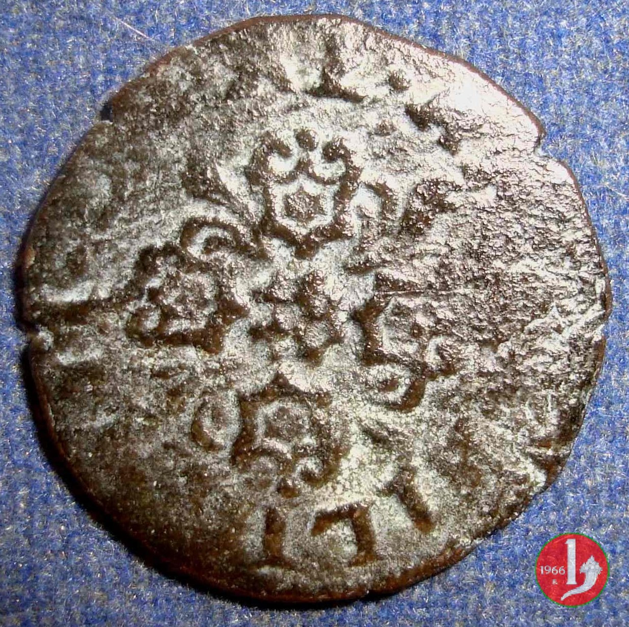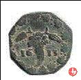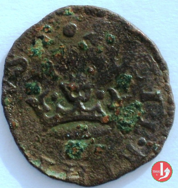 Tornese con Bastoni incrociati Dritto: + PHILIPP III • DG • REX • ARA • VTR • SIC, Due bastoni in croce di S. Andrea, cantonati in alto e in basso da fiamme, ai lati da pietre focaie, al centro acciarino (Varianti) Verso: + PVBLICE COMMODITATI, Cornucopia con frutta e spighe, ai lati la data. | |